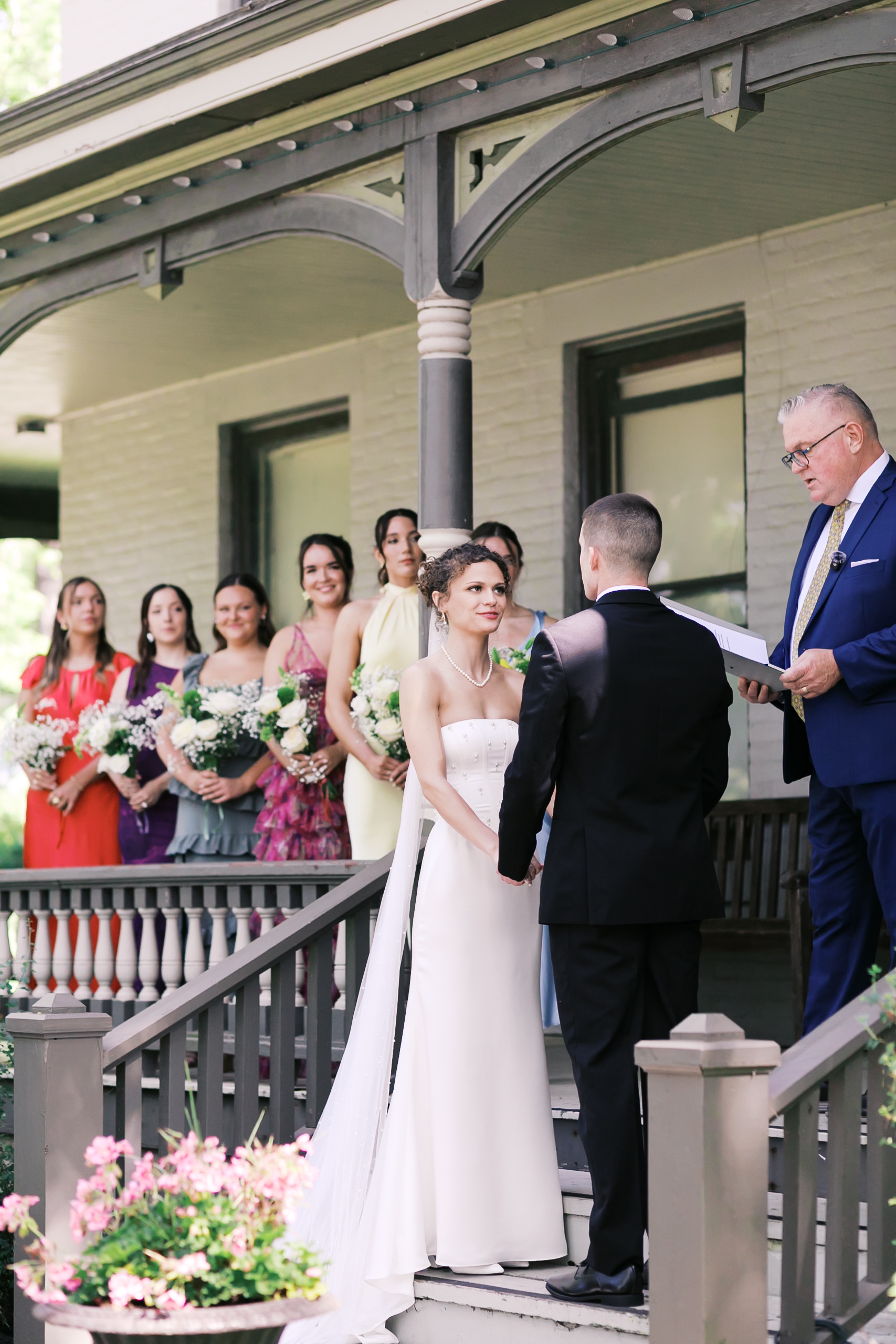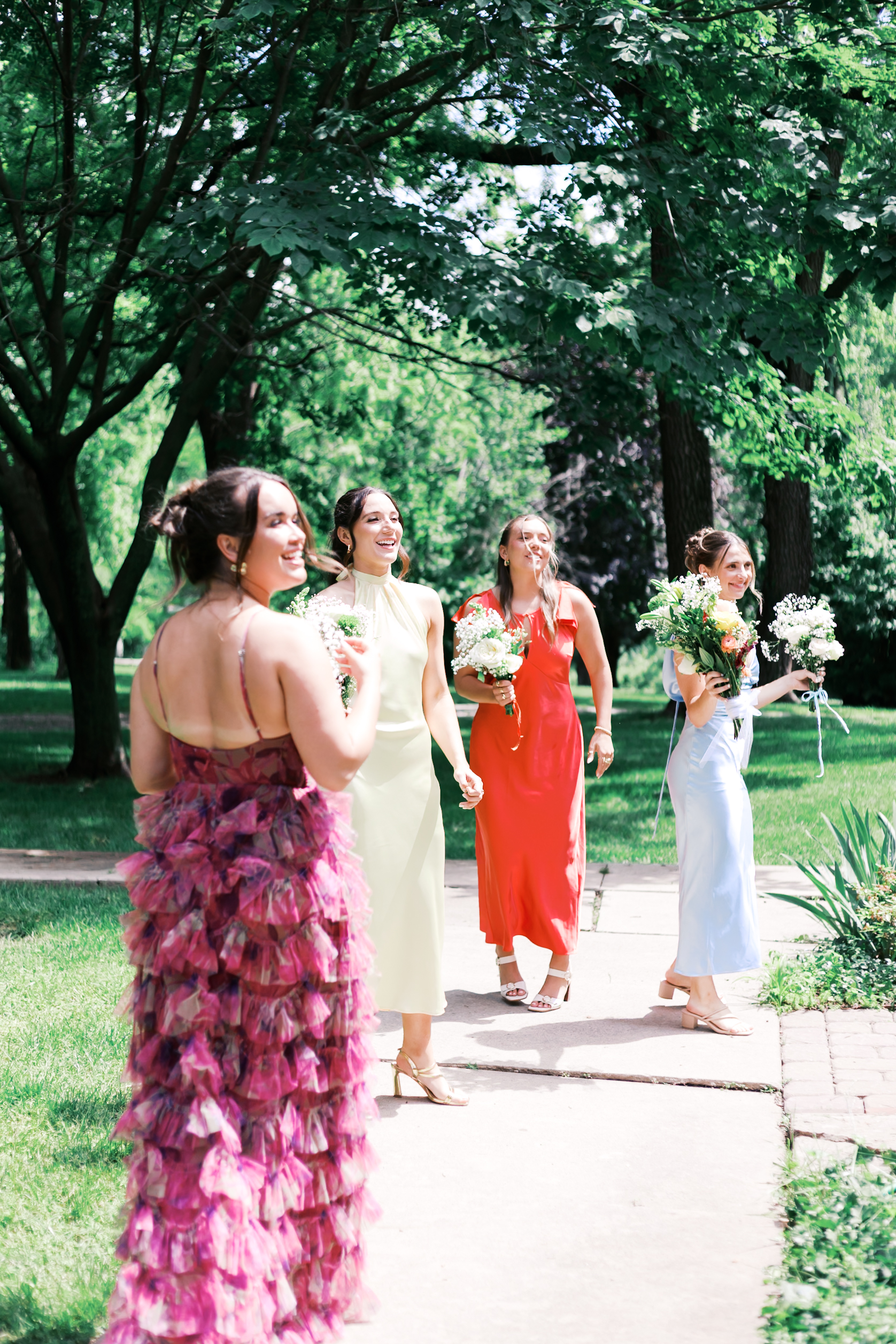 The wedding party wore different shades—light blue, pink, yellow, purple, green, and red—each paired with coordinating flowers. Outdoorsy, colorful, joyful. Exactly the energy Kirsten and Cooper wanted their day to hold.