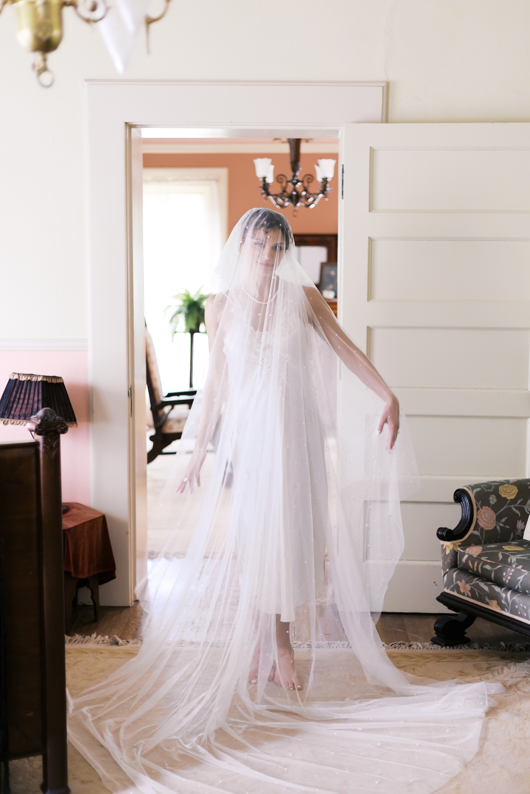 Kirsten and Cooper embraced the mood of the mansion in every way. We took portraits of Kirsten in a vintage thrifted nightgown – one she found herself, of course – paired with her veil. The images felt timeless and slightly rebellious, dramatic without trying too hard. The historic mansion wrapped around her perfectly, as if it had been waiting for this version of the day.