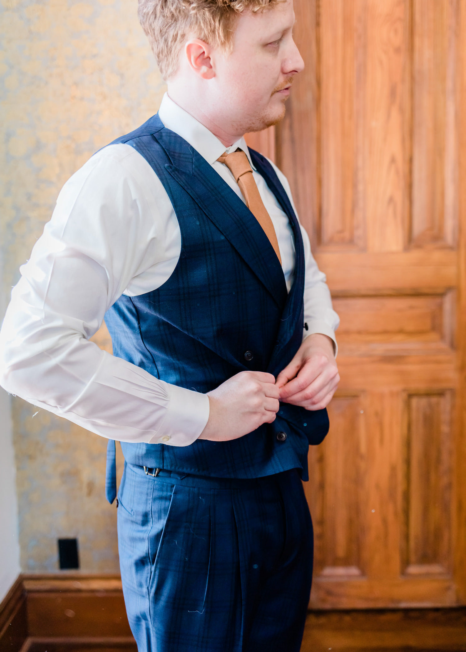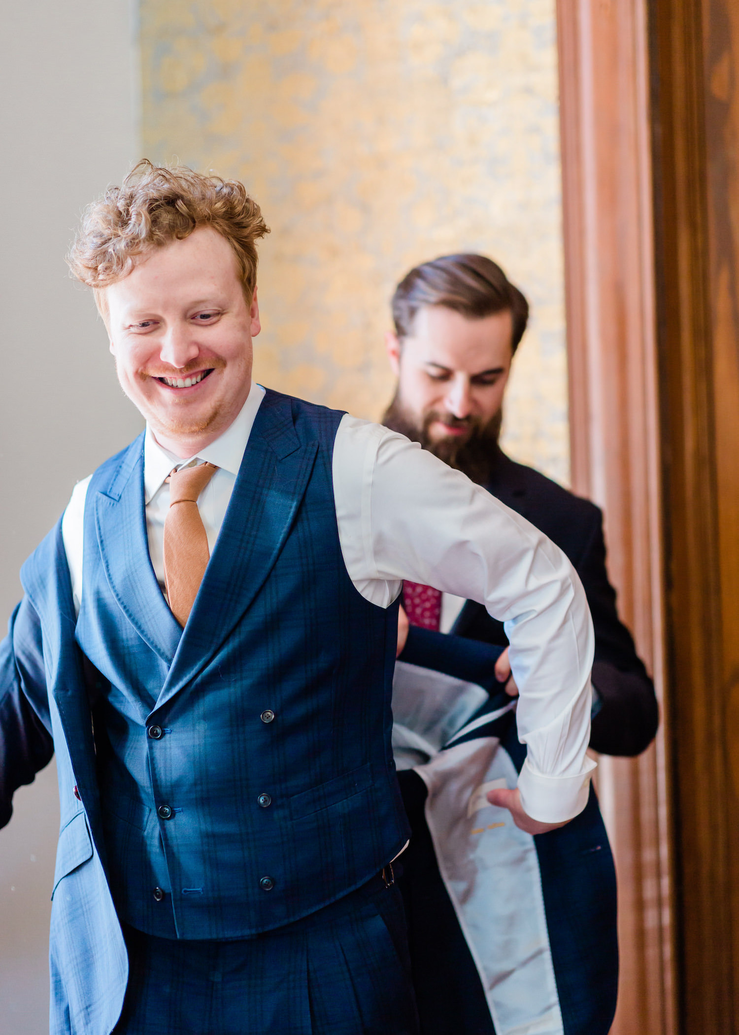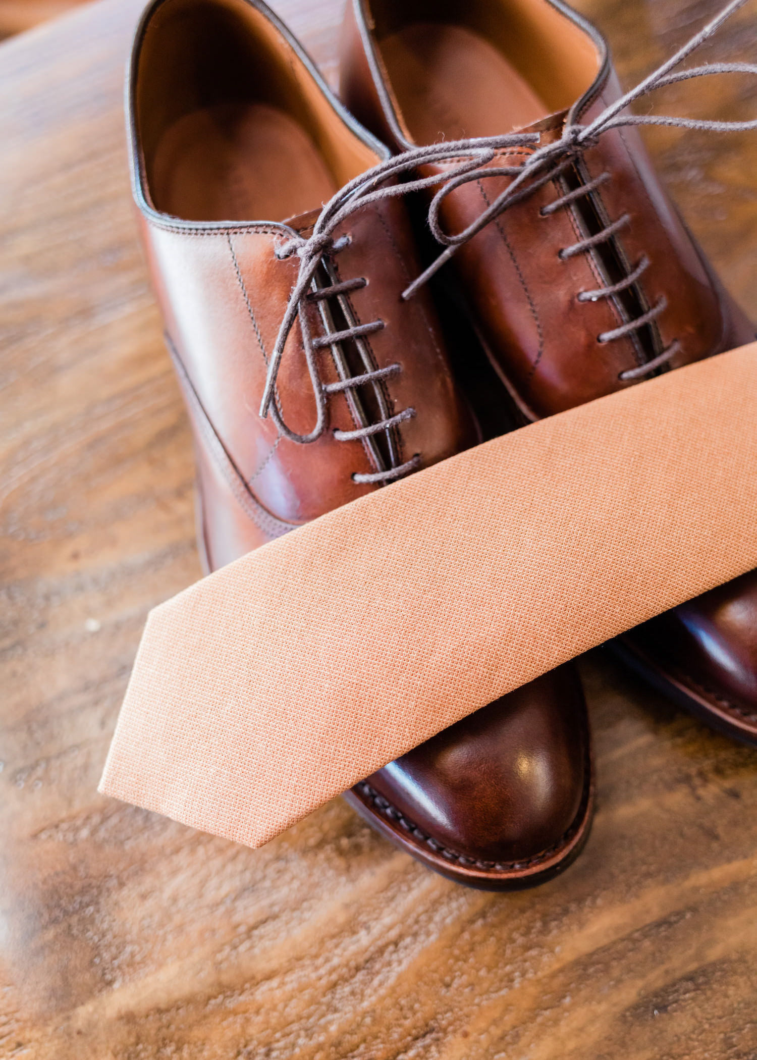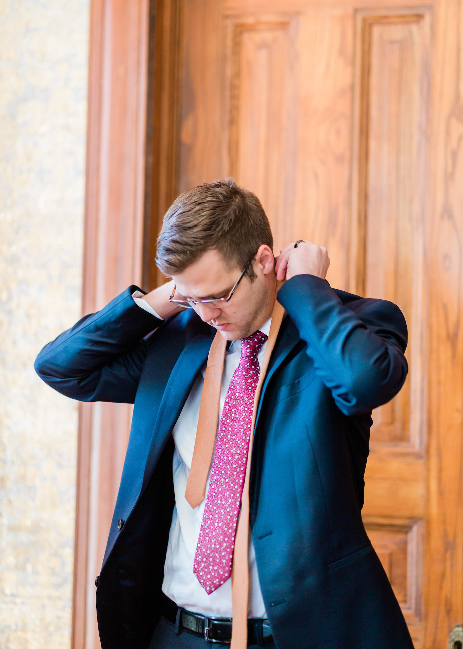 The groom and his groomsmen in their tuxes looked bold and sophisticated! When it came time for Wes to get dressed, he had three choices for a tie. He still couldn’t decide which one to wear! As quickly as I could, I rushed to Shelby with the choices. I held each option up and we had a vote on which tie would look best. It was decided that the tie preference Wes had listed as his first choice was ruled out the quickest. This brought a roaring laugh throughout the entire prep suite.
