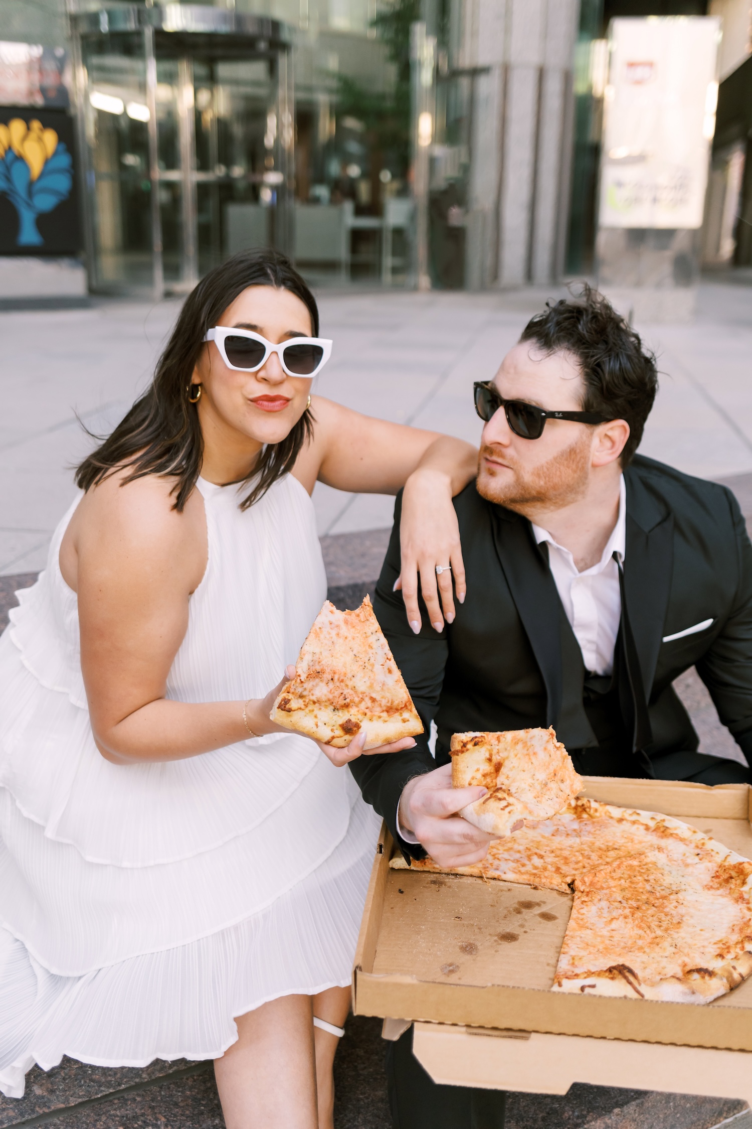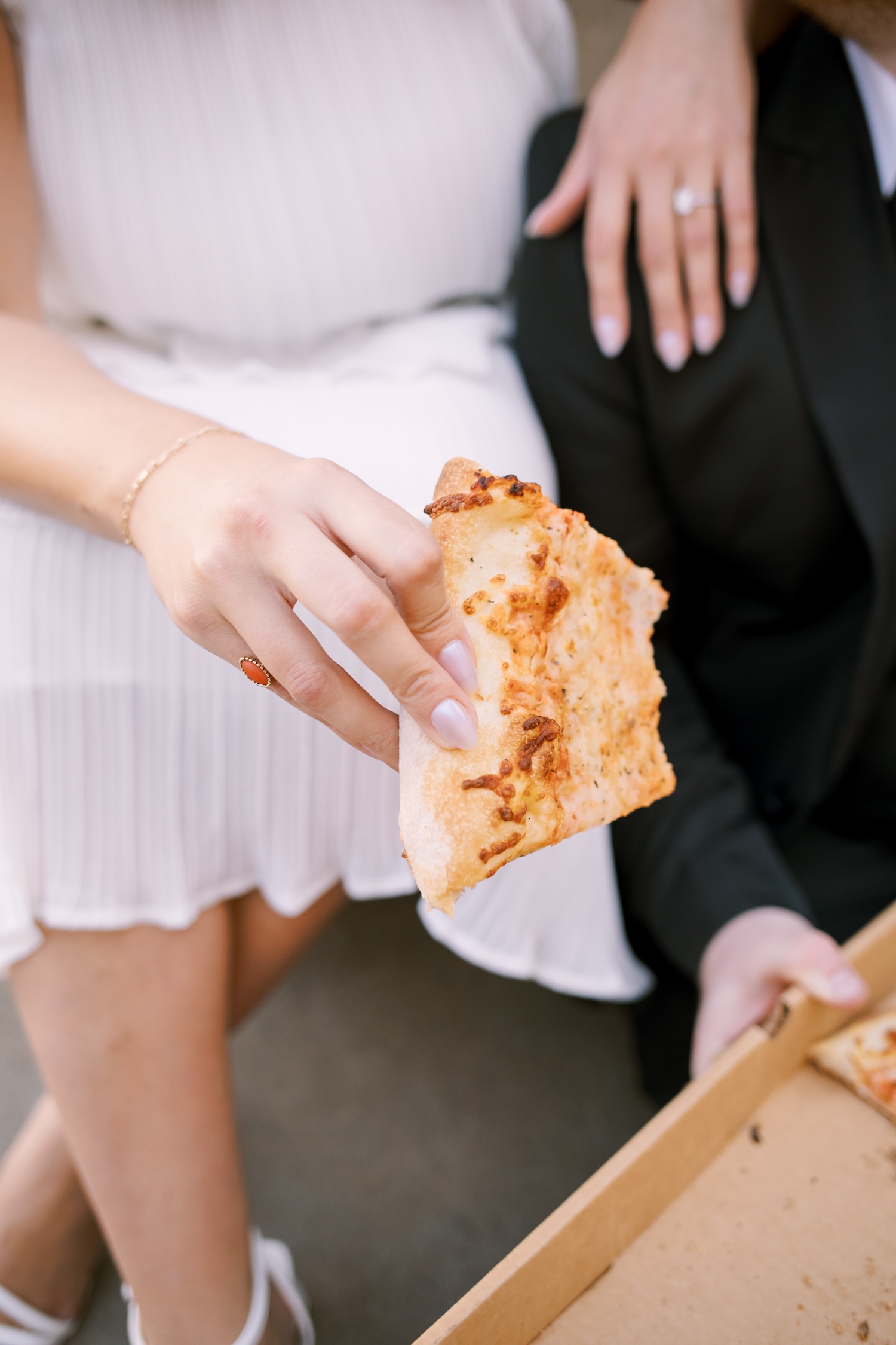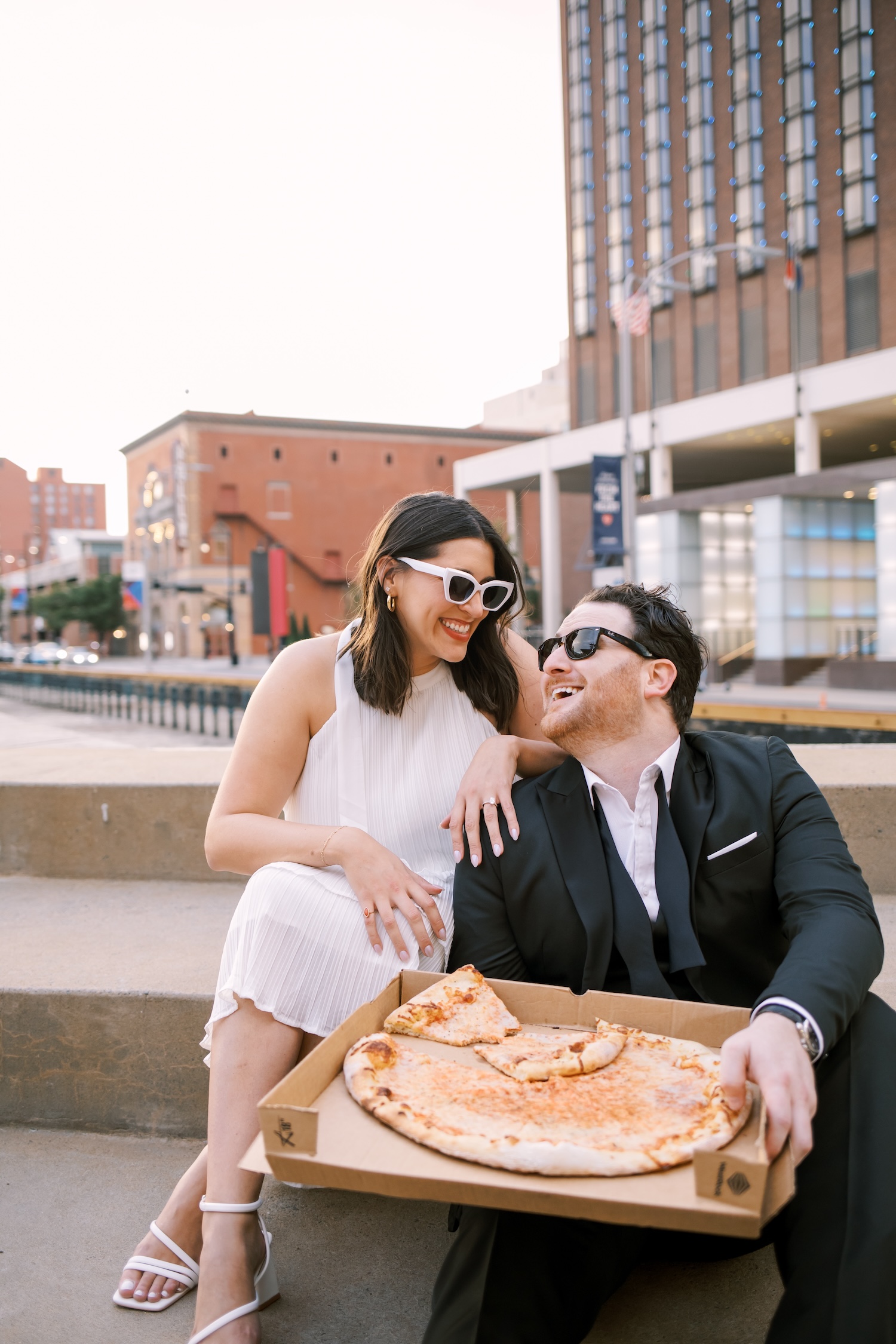 After the sentimental moments in Loose Park, we headed to the heart of downtown Kansas City. This was where we captured Madi and Trevor’s more modern and playful side. Surrounded by the urban energy of the city, we explored some of their favorite spots. One of the highlights? Incorporating pizza into their session! It was the perfect way to capture their fun, laid-back personalities and their love for enjoying life’s simple pleasures together.
