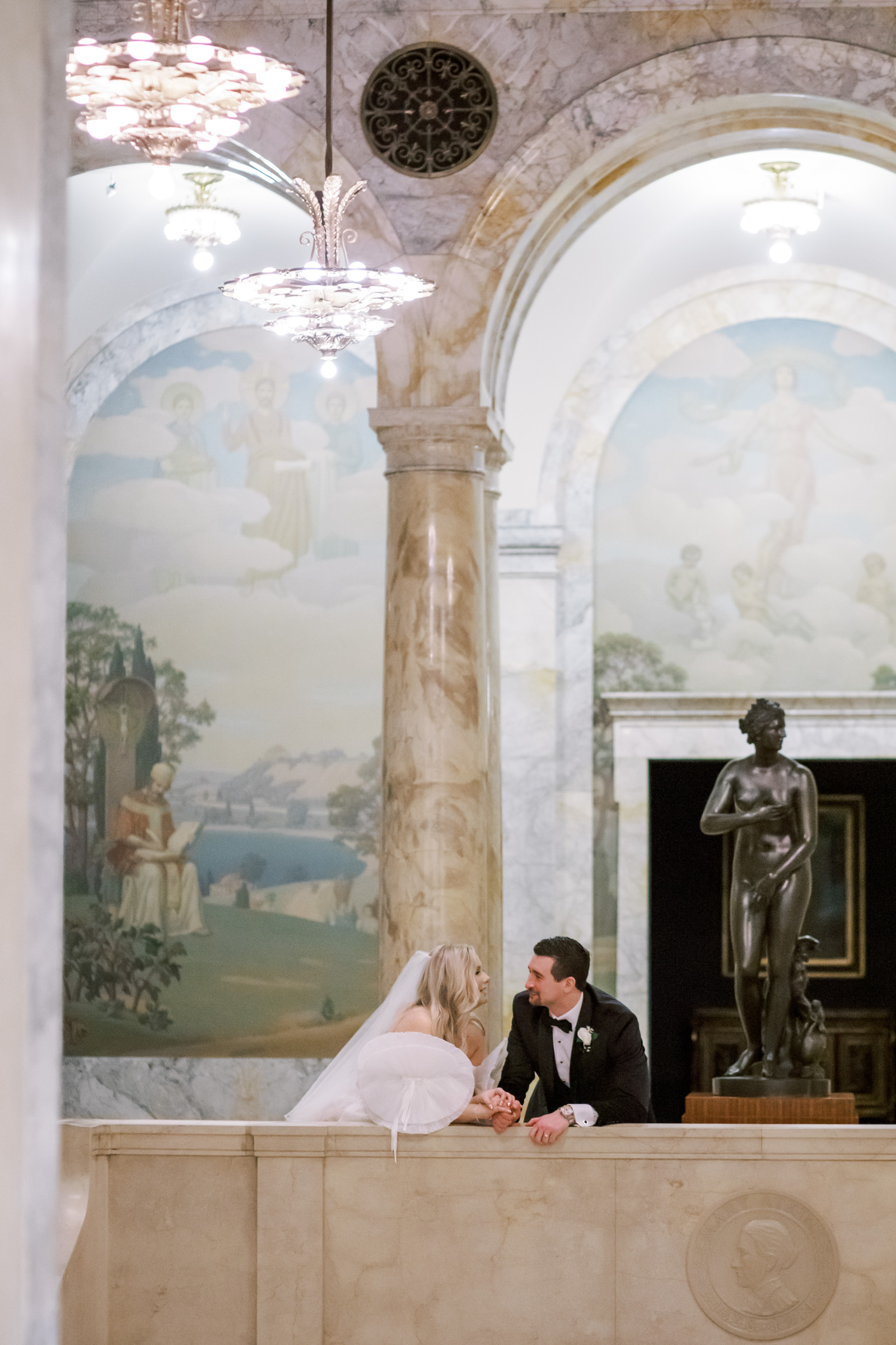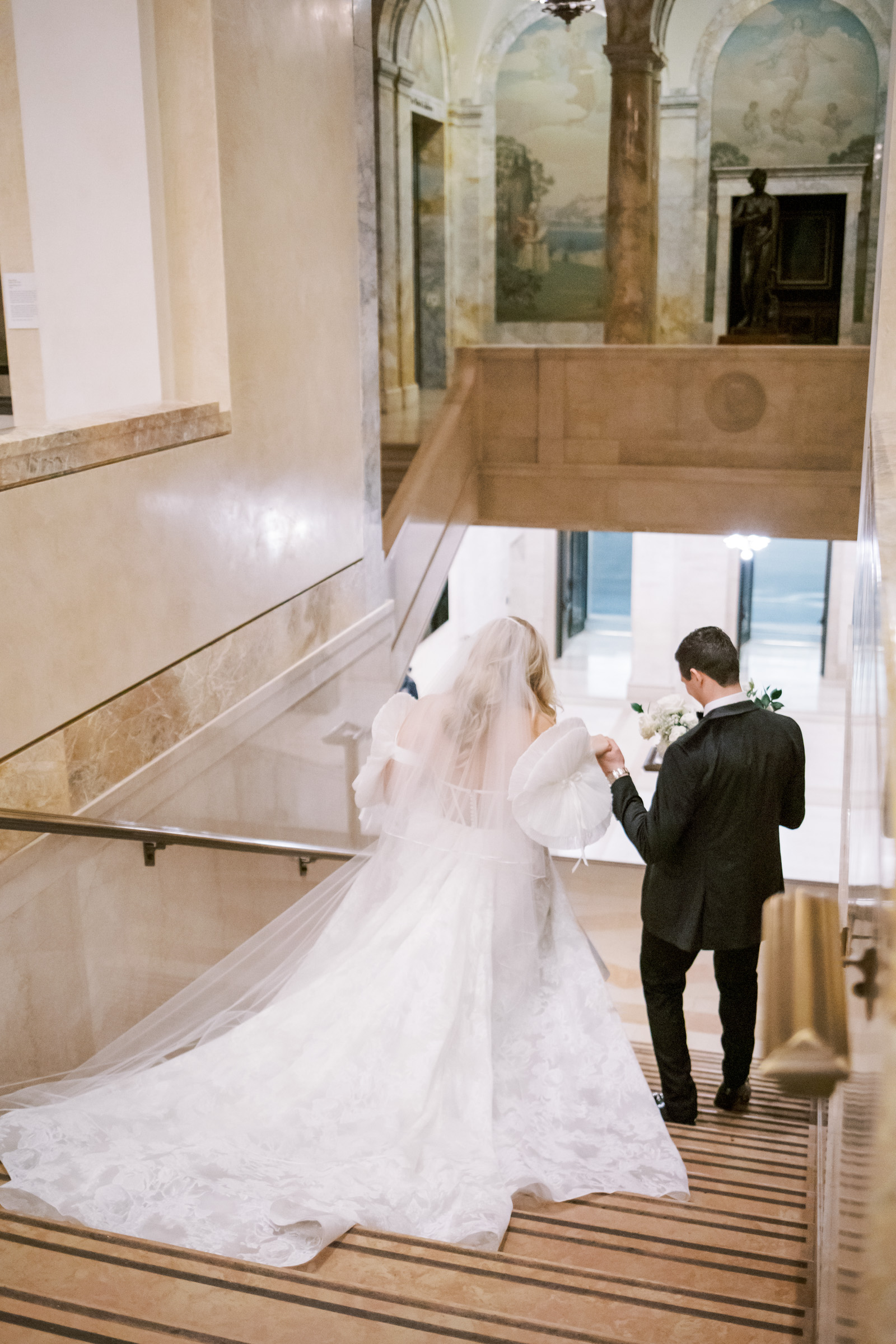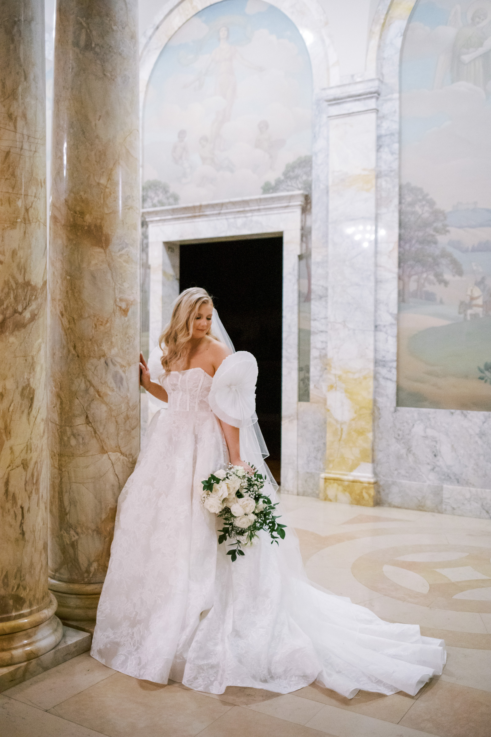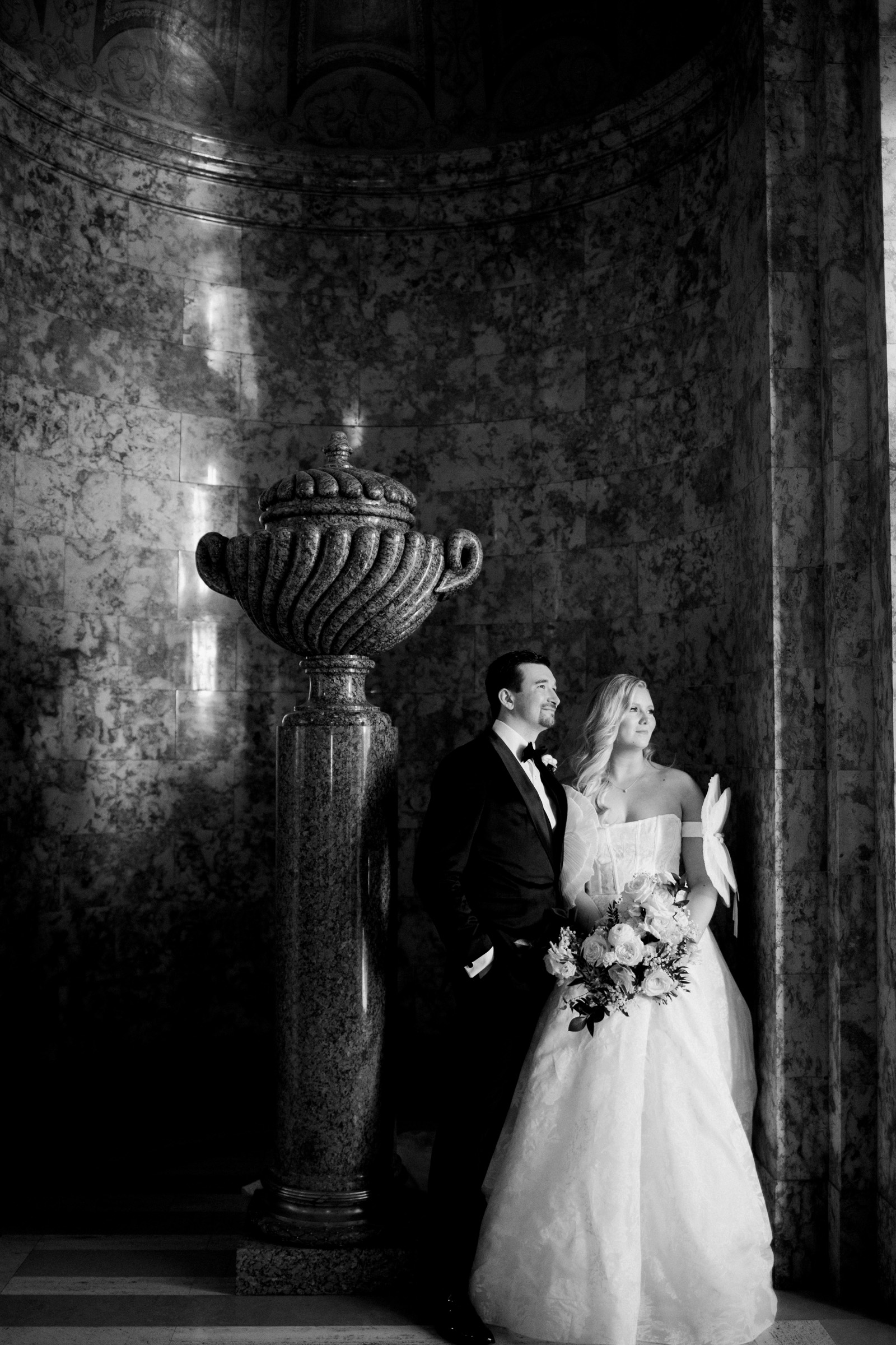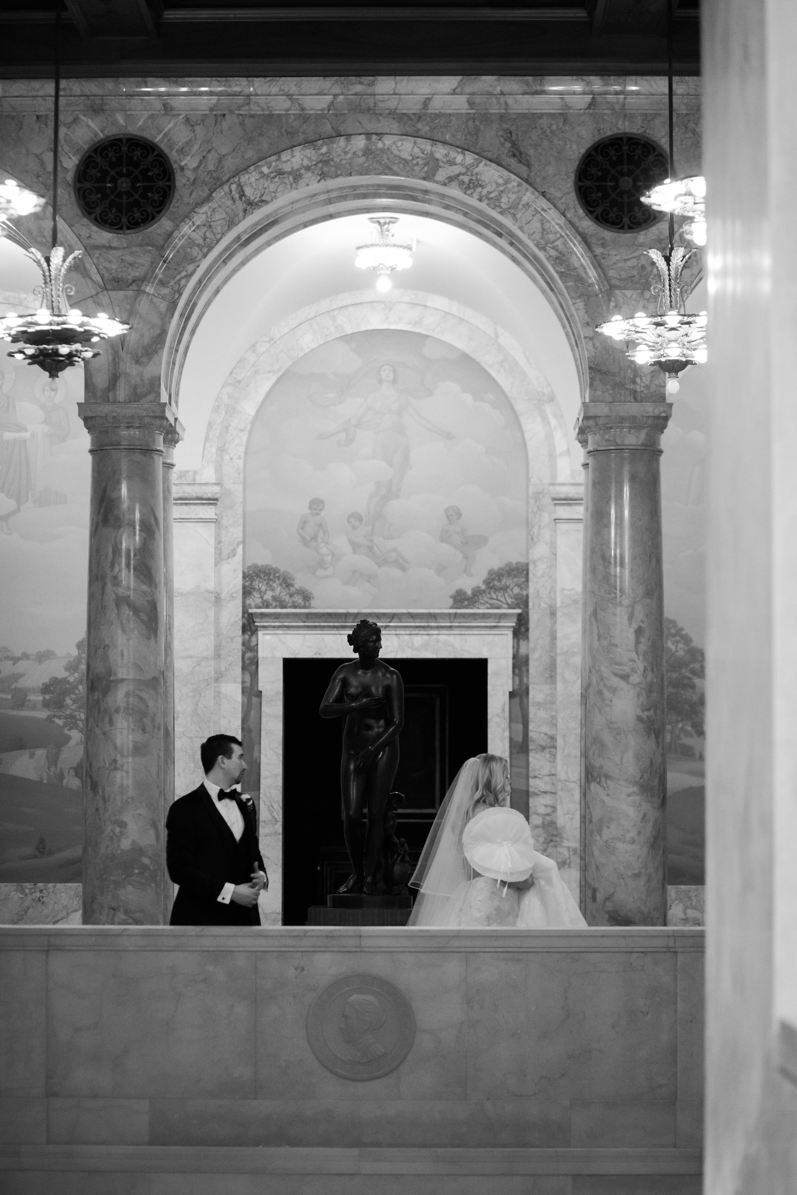 One of the most memorable parts of this Nelson-Atkins Museum wedding was exploring the interior for portraits. Each corridor and staircase felt like a work of art in itself. Gold-veined marble, hand-painted murals, and grand stone arches that framed the couple perfectly.