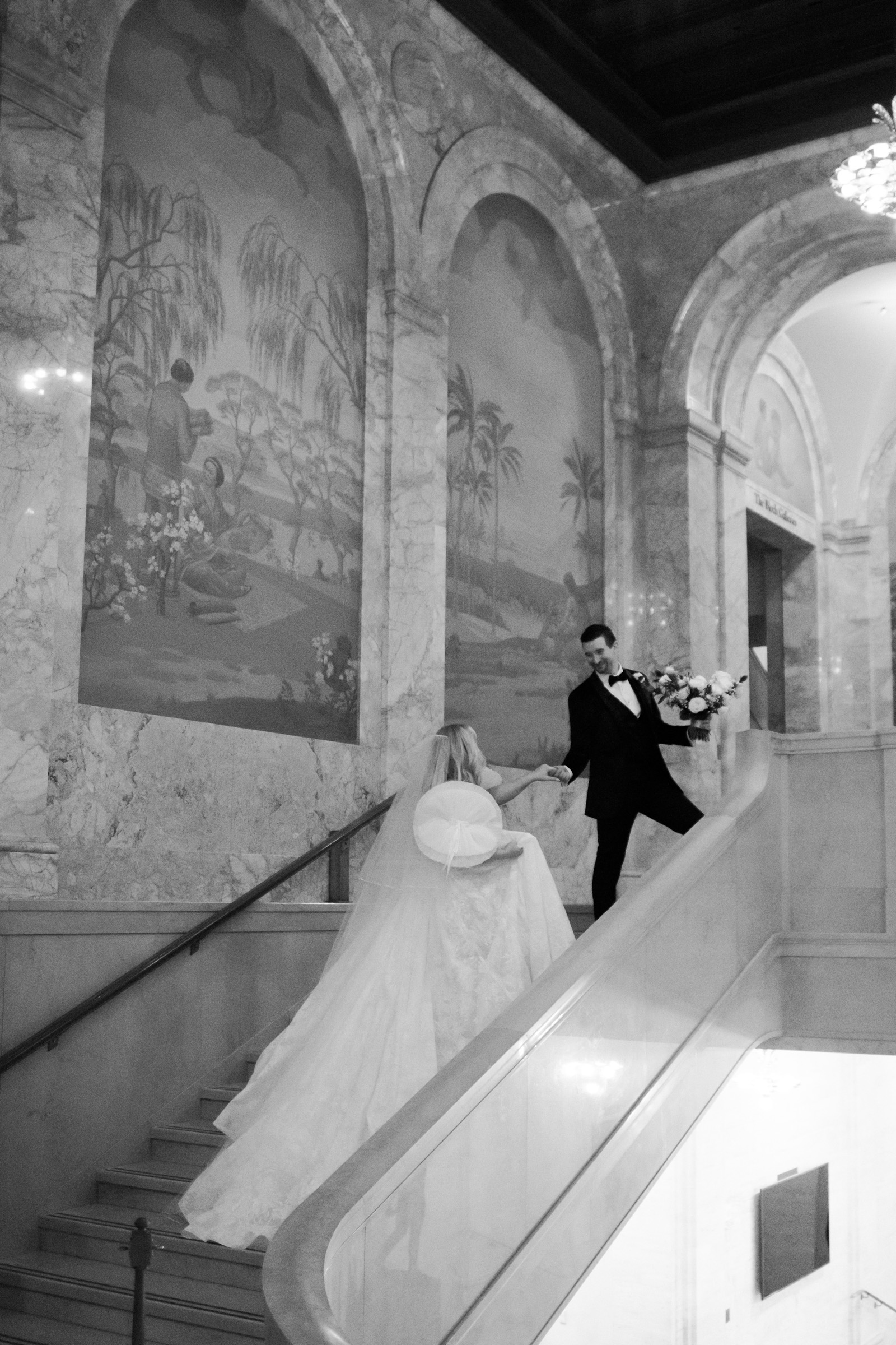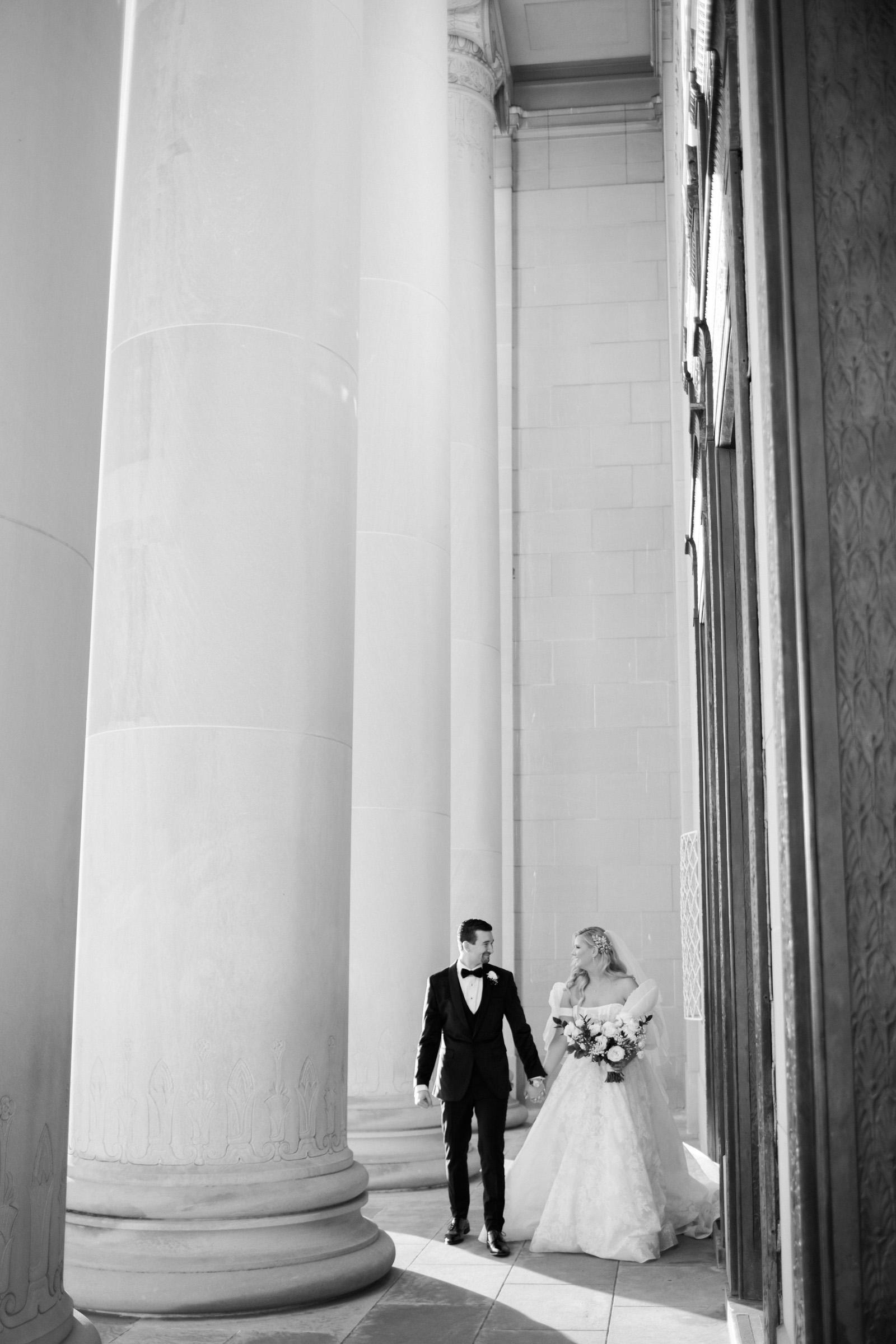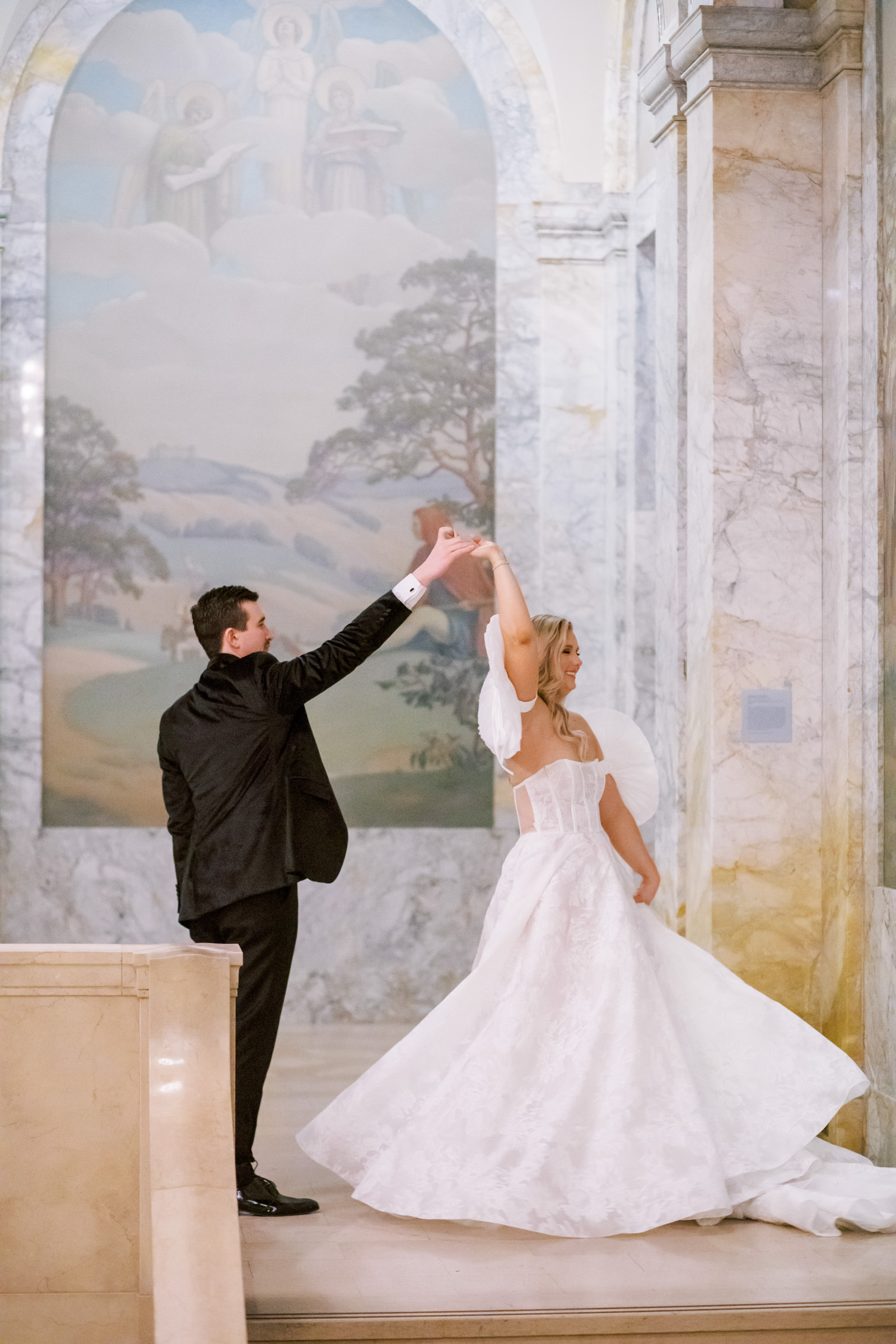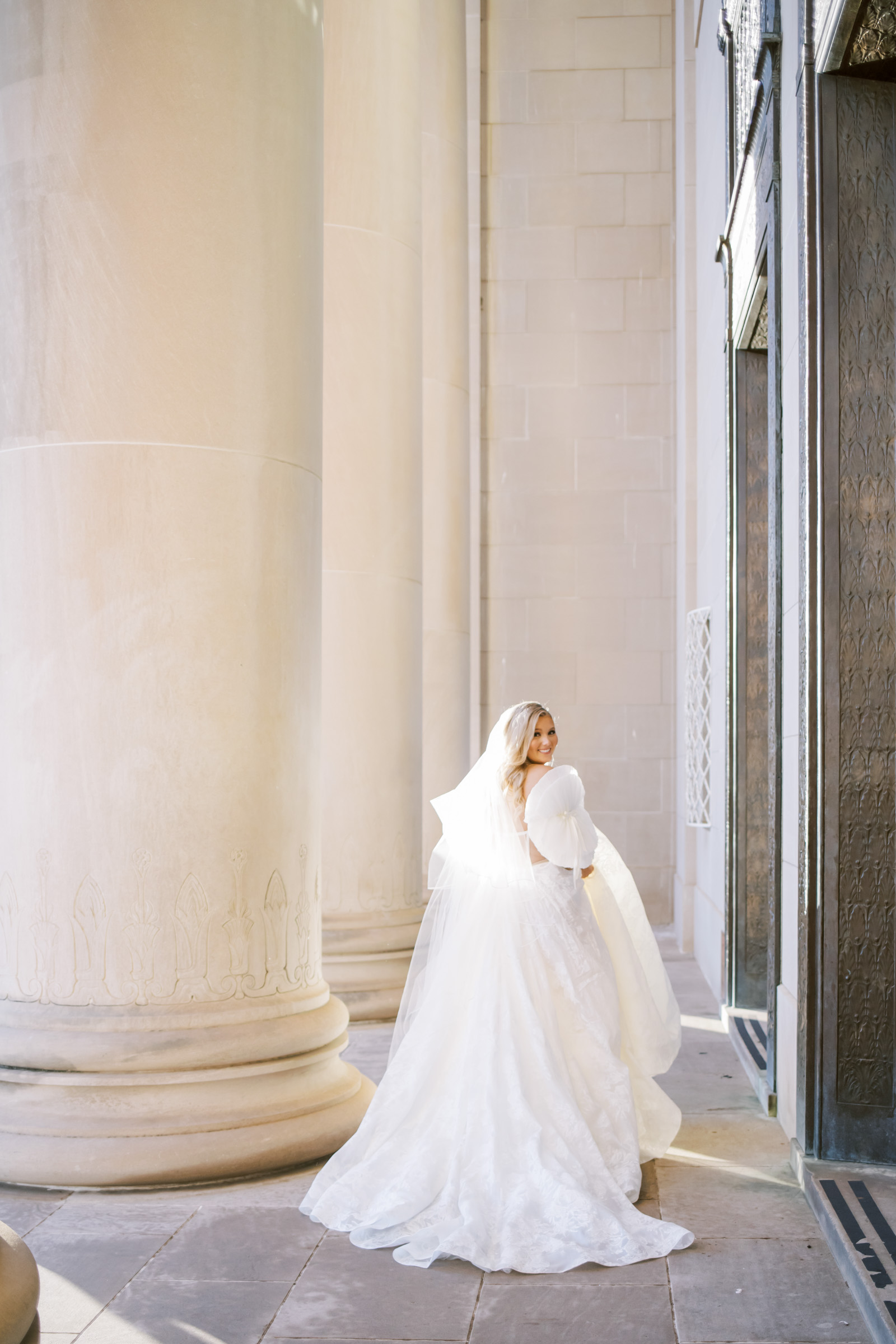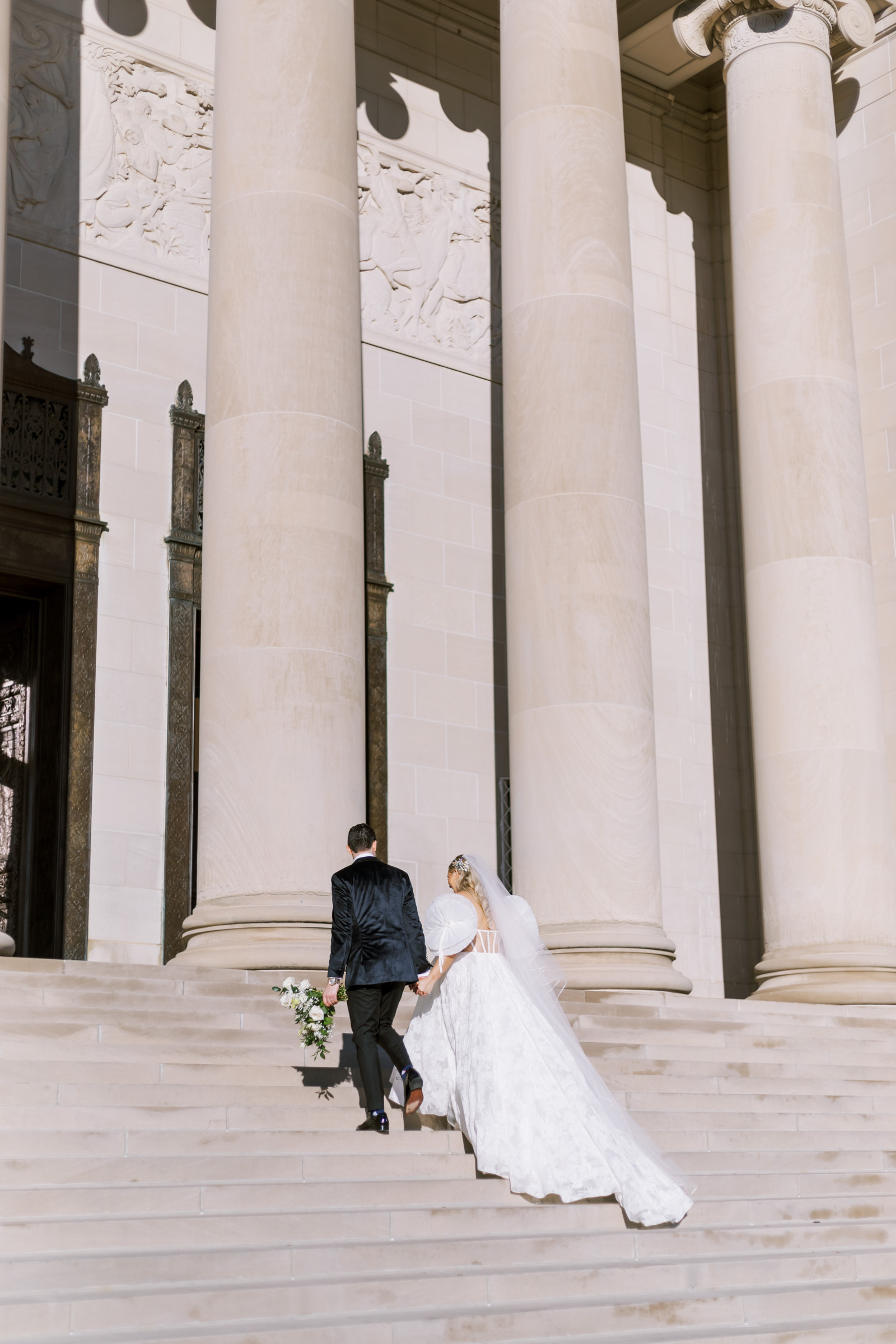 One of the most memorable parts of this Nelson-Atkins Museum wedding was exploring the interior for portraits. Each corridor and staircase felt like a work of art in itself. Gold-veined marble, hand-painted murals, and grand stone arches that framed the couple perfectly.