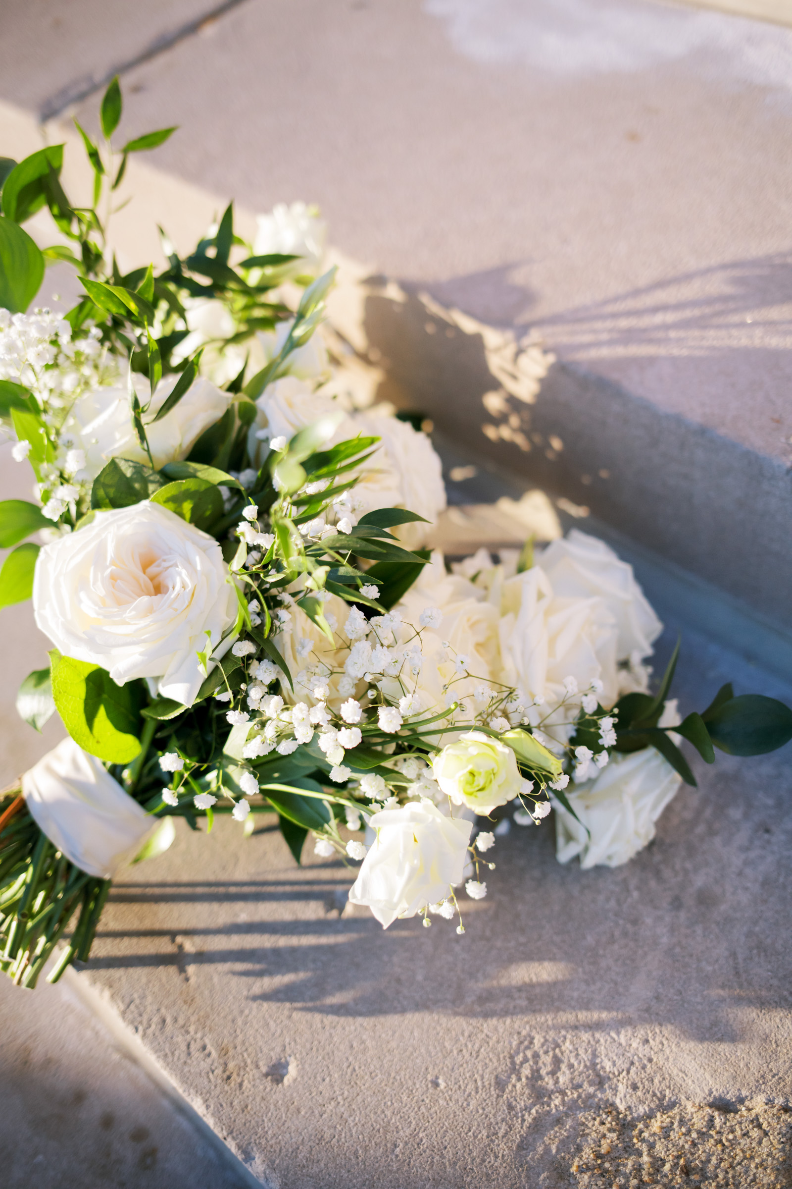 The ceremony took place in one of the museum’s light-filled halls, where soaring ceilings and stone walls created a naturally regal setting. Elegant gold chairs lined the aisle, while lush greenery and soft white florals framed the altar. The clean, minimal design allowed the architectural beauty of the space to shine.