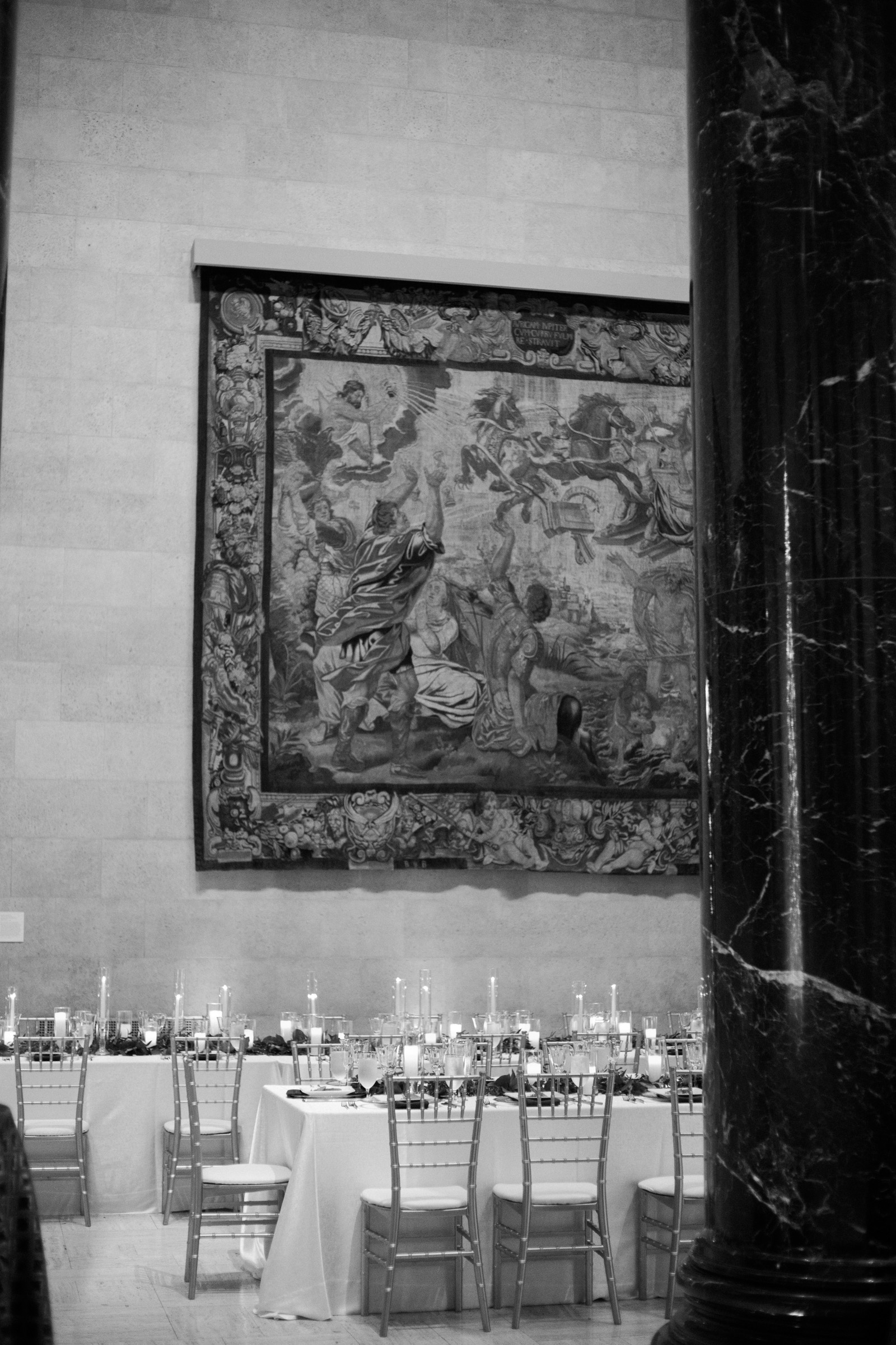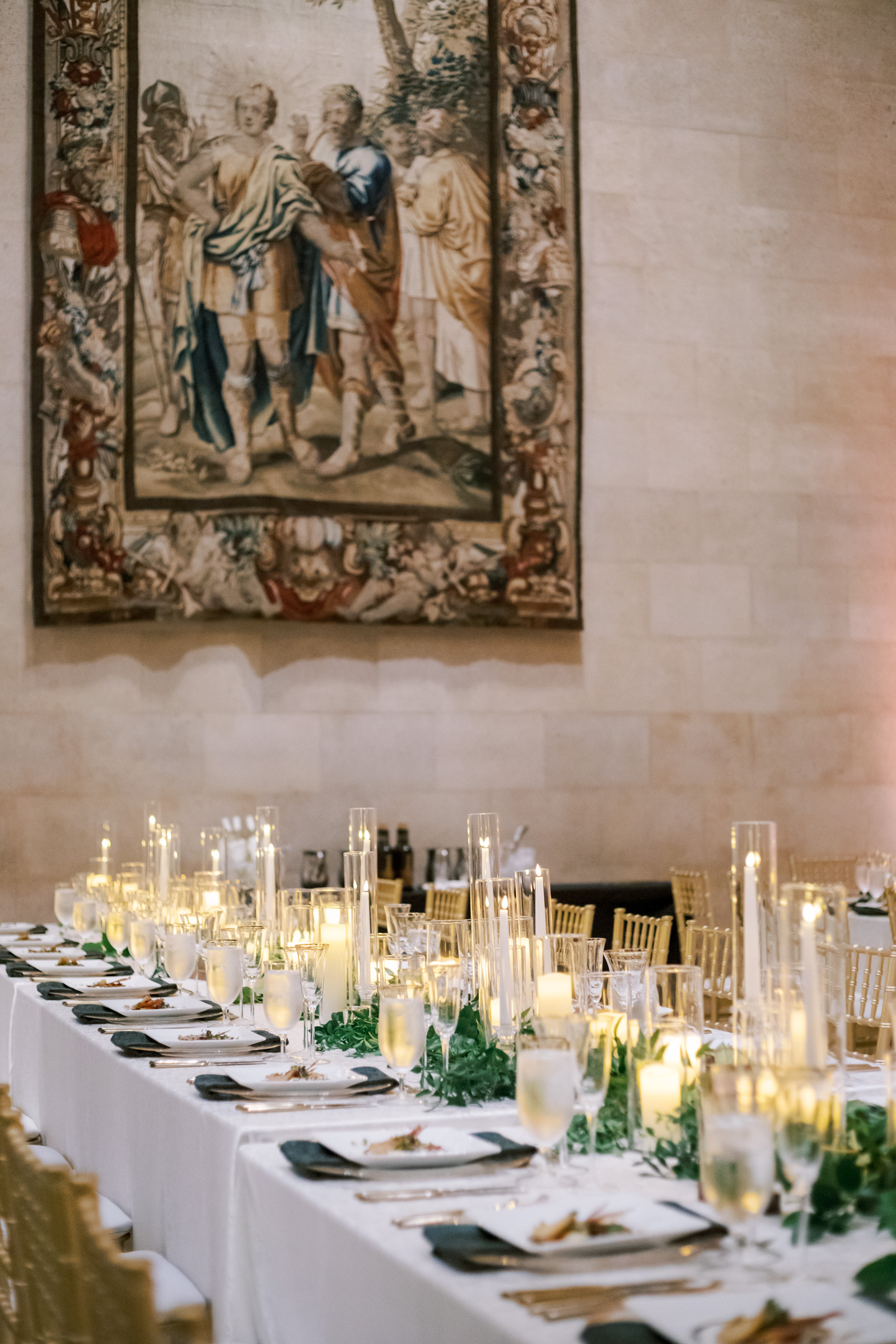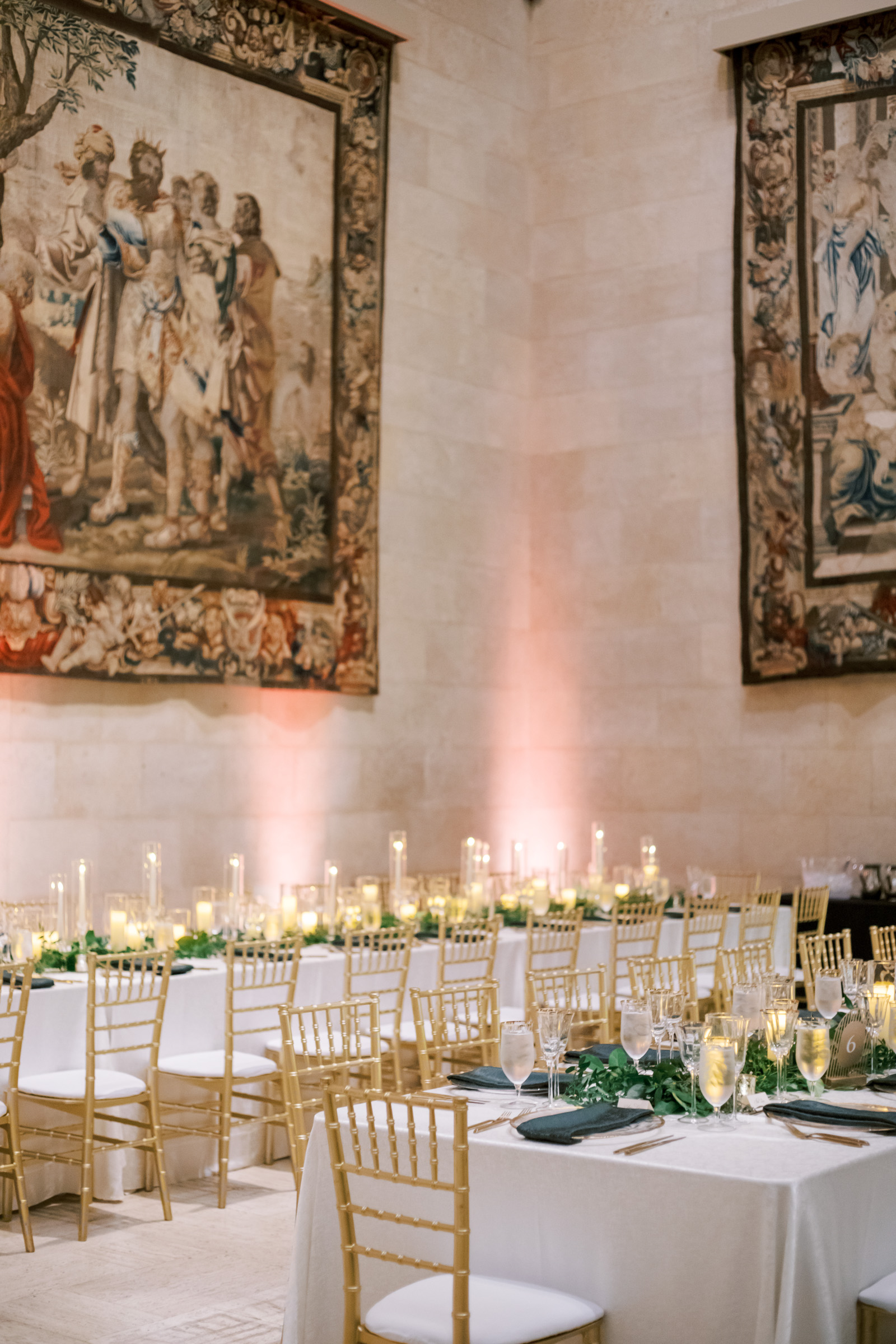 Following the ceremony, guests were welcomed into the Tapestry Room for a candlelit dinner. The glow of hundreds of candles reflected off the limestone walls, illuminating historic tapestries that told their own stories of art and romance. Gold chairs and long tables created a sense of symmetry and grace, while greenery runners and soft white blooms tied everything together seamlessly.