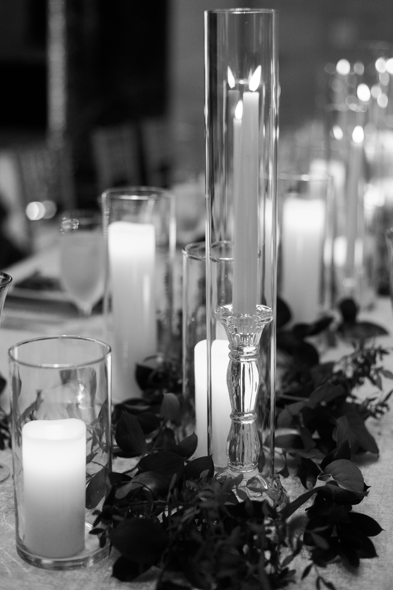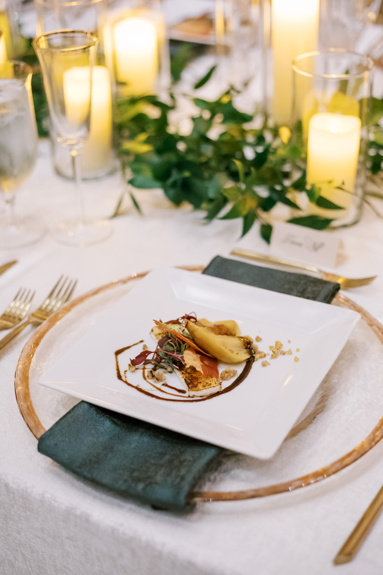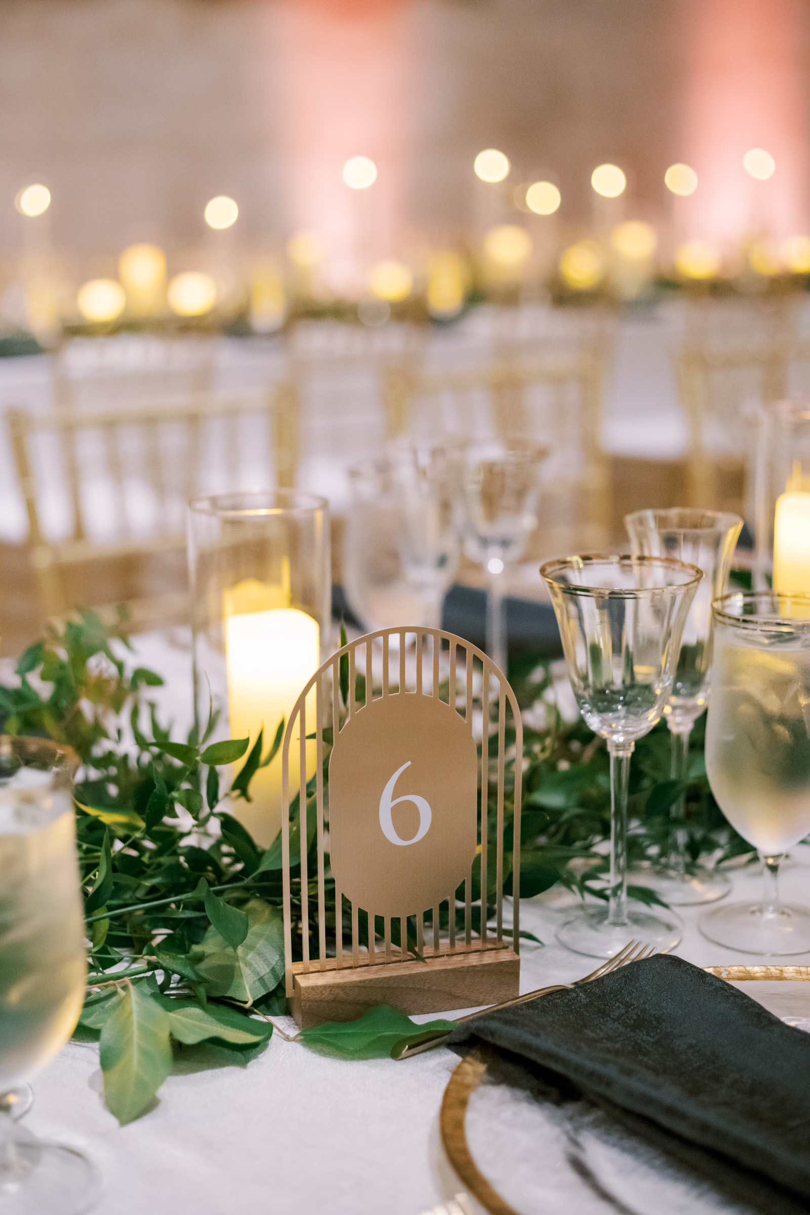 Following the ceremony, guests were welcomed into the Tapestry Room for a candlelit dinner. The glow of hundreds of candles reflected off the limestone walls, illuminating historic tapestries that told their own stories of art and romance. Gold chairs and long tables created a sense of symmetry and grace, while greenery runners and soft white blooms tied everything together seamlessly.